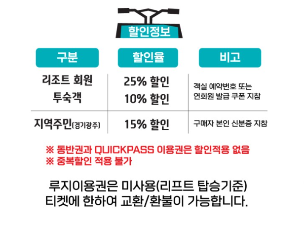 리조트회원은 25% 할인되고, 리조트 투숙객은 10% 할인됩니다. 퀵패스는 할인 안 됩니다.