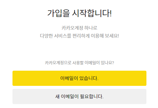 링크에 들어가면 바로 나오죠. '이메일이 있습니다'가 더 잘 보이게 활성화 되어 있습니다. 네, 그렇습니다. 카카오계정은 이메일로 한 번 인증만 해 줄 수 있으면 쉽게 만들 수 있습니다.